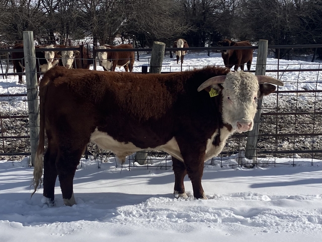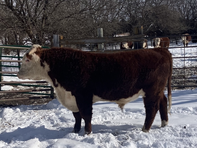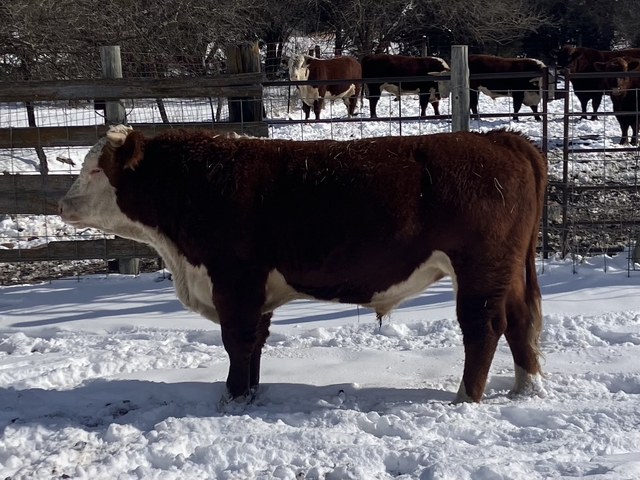 Coming 2 year old Hereford bulls. 33 years of maternal selection. Moderate frame, moderate milk and moderate birthweight. No grain or DDG's, developed for long life. Easy going disposition. Take advantage of heterosis, the only free lunch in the cattle business.Hulse Family Herefords 7854888554