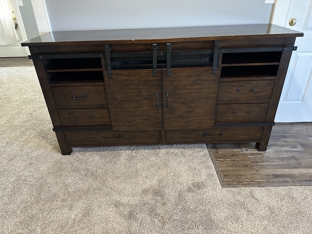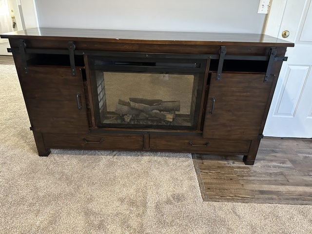 Barn-door style TV Stand with Dimplex electric fireplace (includes remote, has timer features). Have moved and need something smaller for our new space. Everything works as it should. Lightly used, but very nice. A poor handle design was exploited by our toddler - it will need all new pulls. Dimensions - 41” H, 76 1/2” L, 20"D. (7856).3200. onetwo. Was quite expensive new -