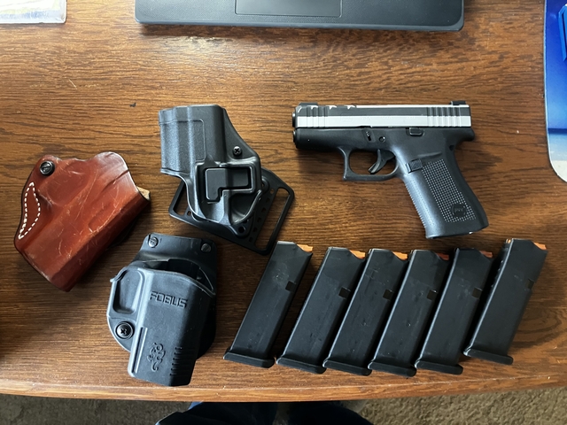 Like new Glock 43X Flag edition from Davidson's. Beautifully done. Comes with 6 magazines, 3 holsters-Fobus, Blackhawk and DeSantis. Total value $785. -$625 for all