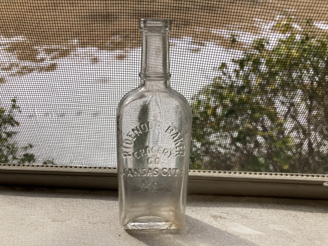 Description Antique clear glass bottle embossed with Ridenour-Baker Grocery Co., Kansas City, MO. From the late 1800's or early 1900's. This small apothecary-style bottle measures approximately 5.5 inches tall and features a rounded rectangular base. A great early regional advertising bottle that displays well and fits nicely into antique bottle or Kansas City memorabilia collections.