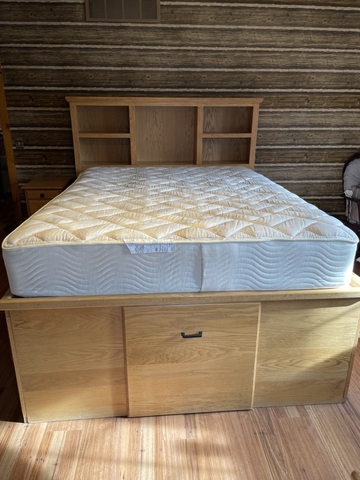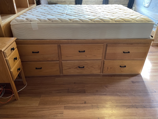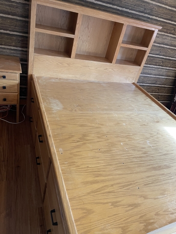 A custom hand made queen bed with tons of storage. If you have limited space this is perfect. Get rid of your and your wife's dresser and pack it all away in this. 6 good size drawers per side plus 1 jumbo drawer on the end. Also has 2 night stands with 3 drawers and a vanity with 2 smaller stands and a tri fold mirror. In good shape but came from a family home. It has nail polish on 1 nightstand and a few scratches and cup marks. Would be really easy to refinish if you'd like. $800 cash meetup in Pratt or Cunningham. Can send better photos and videos