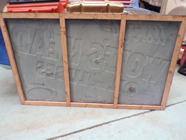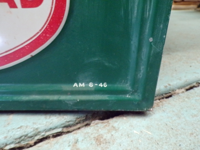 Very nice original single sided embossed painted sign. Wood frame is very good as well. Not mint - has some scratches and some fading of the color on top edge of sign. 58" x 34". Call 6206176644 - emails & texts are usually ignored as a scam.