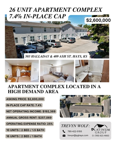 Turnkey multifamily opportunity in one of Hays’ most reliable rental areas, just minutes from Fort Hays State University. This 26-unit complex offers low vacancy, strong tenant retention, and minimal deferred maintenance, making it a solid option for both seasoned investors and those entering the multifamily space.