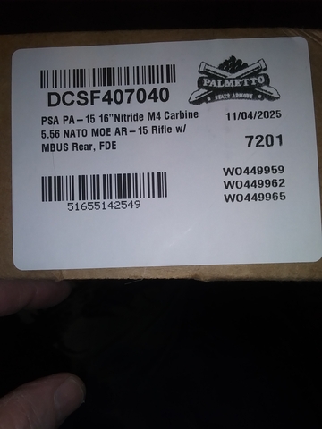 I have a new Palmetto State Armory (PSA) PA - 15 16" Barrel M4 Carbine 5.56 NATO MOE AR-15 Rifle w/MBUS Rear, FDE. / Also (2) 30 rd. Mags. Cardboard Box. *** This M4 came in damaged, small hole in box / (2) Nicks in charging handle / Stain on the protective eggs shells. *** PSA will only offer me a $50 gift card - This is why I'm selling it - It's there customer Service, that's the problem. Please text Dave @ 785-713-0739 anytime *** Cash Only *** No Trades *** Firm on price ***
