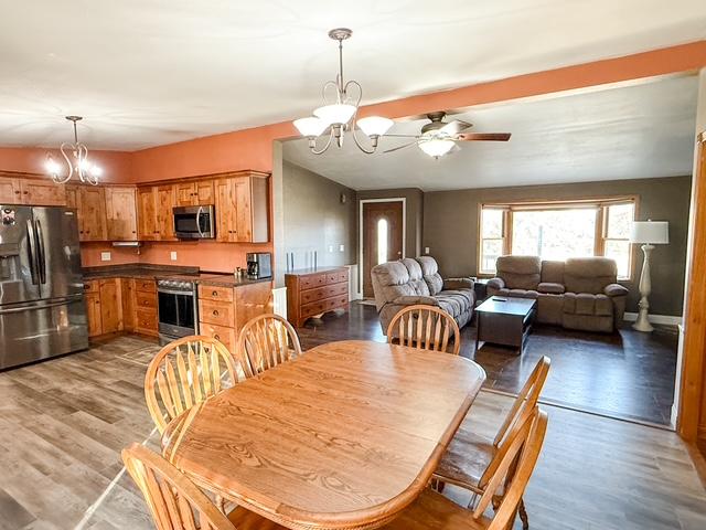Step inside to an open-concept layout where the living room, dining area, and kitchen flow together seamlessly, ideal for hosting family and friends. The kitchen is truly a dream, featuring abundant counter space, updated cabinetry, a pantry, and appliances that stay. Natural light pours into the dining area, which offers ample space for gatherings and opens through patio doors to a covered patio, perfect for morning coffee or evening relaxation.