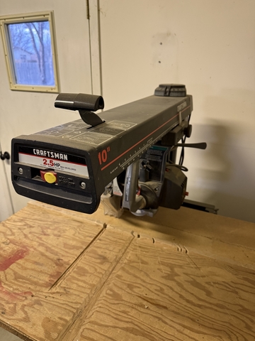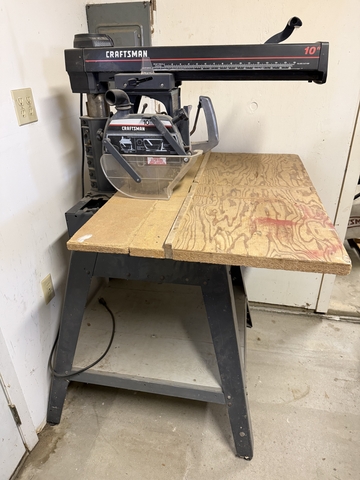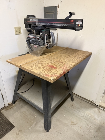 Craftsman 10” Radial Arm Saw – Heavy Duty • Brand: Craftsman - Type: Radial Arm Saw - Blade Size: 10 inches - Motor: 120V, 11.0 Amps, 3450 RPM (Model C48BXGMH578-A – 2.5 HP) - Condition: Used, tested and runs strong. Some cosmetic wear from use, but solid and functional. - Includes: Original stand, adjustable arm, blade guard, and mounted blade. - Features: Adjustable arm for crosscuts, rip cuts, bevels, and miters - Heavy-duty steel stand included Reliable Craftsman build quality.