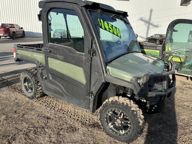 2023 John Deere 835M Gator, 54HP Gas EFI Engine, 6697 Miles/1083 Hours, Power Steering, 4wd, Olive Color, Enclosed Cab, No Heat or AC, Black Alloy Wheels, Front Brush Guard. Stock #U32976.