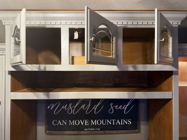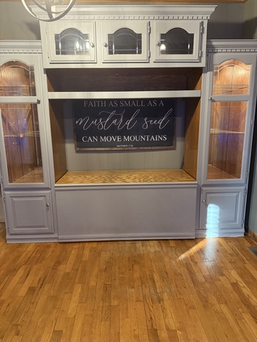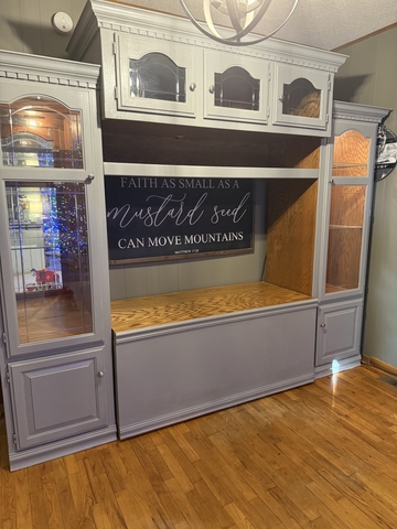 The side and top cabinets have lights inside. Breaks down into five pieces. Has some paint scuffs. 103"Wx85"Hx21"D