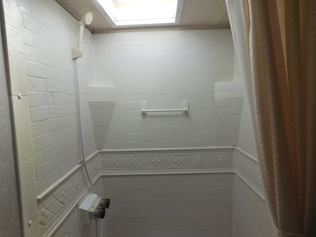 Bathroom has shower with a skylight and LED lighting