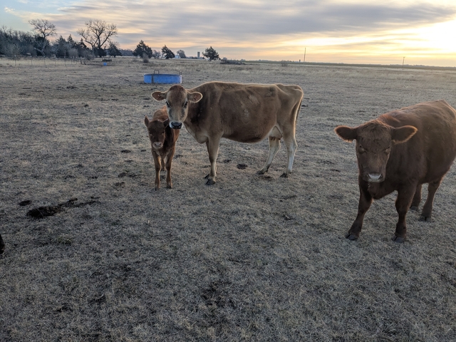 5 year old Jersey milk cow with a nice 4 month old heifer calf. Calf is half dexter and cow is full Jersey. Cow is very tame and gentle. Walks right into the stanchion to be milked and doesn't kick. Not a huge milk producer currently but good for a small family. We separate the two for 8-10 hours if we want to milk. We only take a half gallon off at a milking but there is definitely more there. We (the kids) just do it for fun and definitely aren't trying to maximize production. Would make someone a great family milk cow.