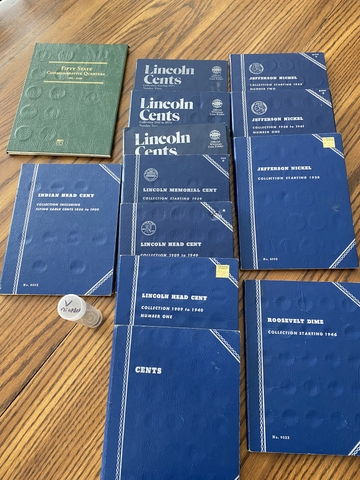 I have several different coin sets for sale.NONE of the books are completely full. PLEASE READ THE POST FOR PRICING etc.I have checked with dealers and they have given me some suggestions as to how to sell these. There are eight books with different years of pennies, there are both Indian head cents and Lincoln pennies.  there are three books that have Jefferson Nickels in them and I have six individual V Nickels. I have a book that has Roosevelt dimes in it and I also have a state Quarter collectible book that has 31 of the quarters in it. as I stated none of these books are completely full. There is a really nice variety of stuff pretty much. Everything is old with the state quarters being the newer items. You’re welcome to contact me with any questions. Pricing will depend on exactly what you’re wanting. I am willing to separate the books. I will not take the coins out of them, but I will sell them individually or as a group the more you buy the better the price is going to be. I’m always open to reasonable offers. I will not ship these. Everything is located in McPherson Kansas.