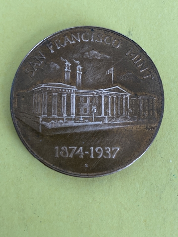 Located in McPherson. This is a San Francisco mint treasury department commemorative medal Commemorating the old San Francisco mint building from 1874 to 1937. It measures one and a half inchdiameter by an 8th inch thick. It is in good condition. I believe it is either Copper or bronze I'm not sure which. Feel free to ask any questions I am always open to reasonable offers