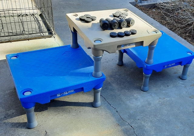 A full Klimb Dog Training System. 3 platforms 24X24, 3 sets of 12" legs, 3 sets of Sure Feet, 1 set of 6" legs. Gently used. Great for Dog Trainers wanting to boost training to the next level.