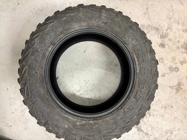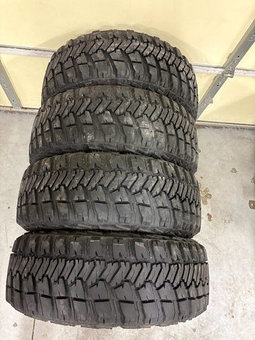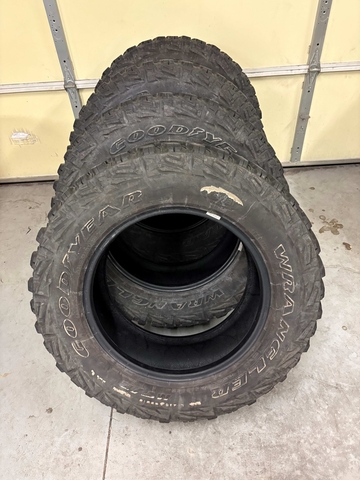 Set of Goodyear Wrangler MT/R, kevlar reinforced sidewalls, LT275/65R18. These are 32" diameter, tread depth- 2 tires 14/32", 2 tires 15/32". These are some mud slinging monsters that sing to you going down the road. A couple tires show some curb rub. Cash and carry, can mount & balance