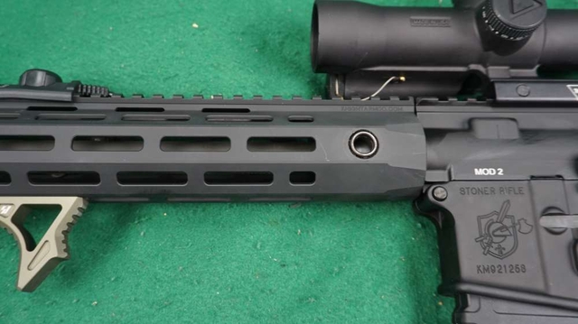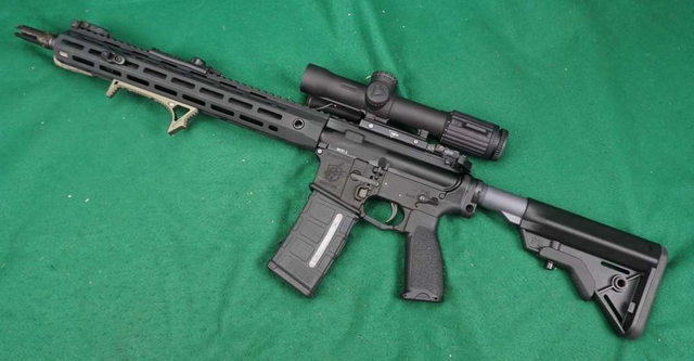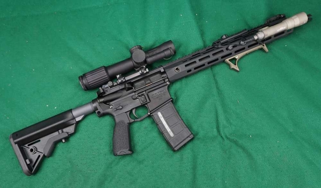 Serial number: KM92158 Finish: The black finish on the metal shows only light use and handling. No specific cosmetic issues to note.Barrel Length: 16"Bore Condition: Clean and shiny with sharp rifling. Stock/grips: The stock and pistol grip show no wear of note. LOP: Adjustable, Magazine capacity: 30 rounds, The rifle comes with one magazine and the range bag. There is a Surefire Scout Light with pressure switch that appears full functional. Mounted on the rifle is a Trijicon V-Cog 1-8x illuminated scope. The scope appears clear and fully functional
