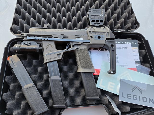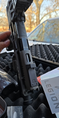First off this is a factory Sig/Flux Raider in the Legion variant. That said, I traded off the factory "comped" slide for a X5 Legion slide that uses a 1911 guiderod and springs. The one it comes with wouldn't allow you to use a longer barrel/comp or suppressor because of their dorky expansion chamber/comp.