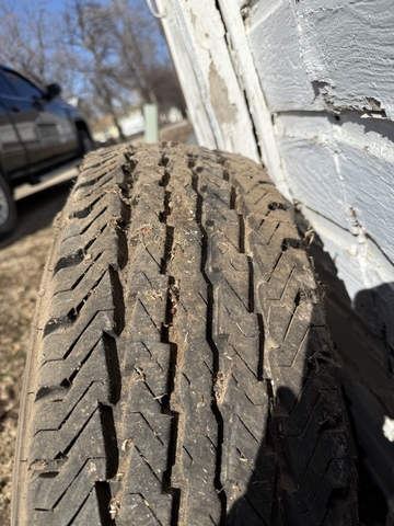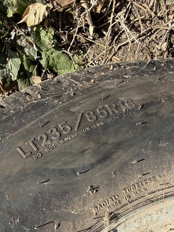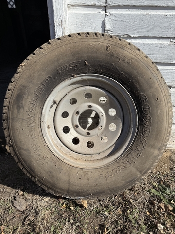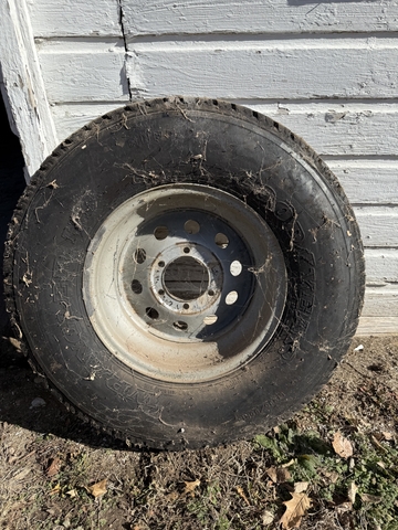 Goodyear LT235/85R16 on 6 lug rim. Very few miles if any. The only rust is from where it was bolted on the spare tire mount. No cracking.