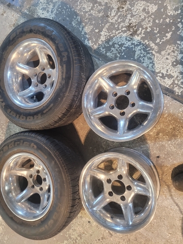 Nice set of aluminum wheels with no pittin or chrome flaking. These wheels are GM bolt pattern 5x4 3/4. Fits G bodie S10 and so on. 2 of the wheels are 15x9 and the other 2 are 15x7. Make me an offer.