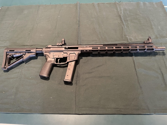 This is an excellent condition premium Fox Trot Mike FM9 Pistol Caliber Carbine (PCC) in 9mm. This is an AR style rifle but fires 9mm rather than .223/5.56 which makes it much more economical to shoot. Recoil is light.