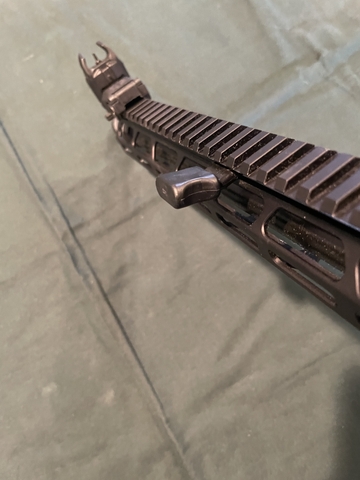 Top rail accomodates any red dot with the appropriate mount or rifle scope. It works great with a Holosun 510 c red dot which is listed separately. Operates just like an AR, except for the side charging handle.