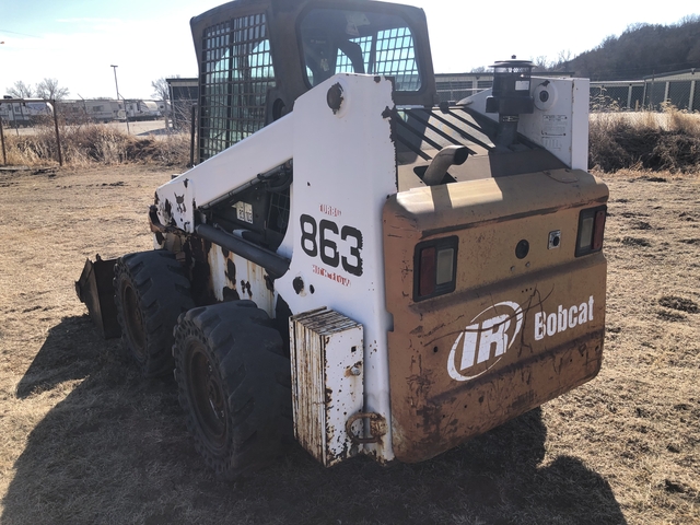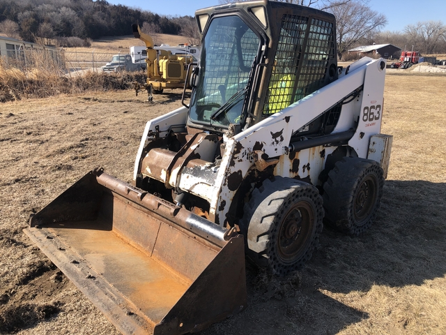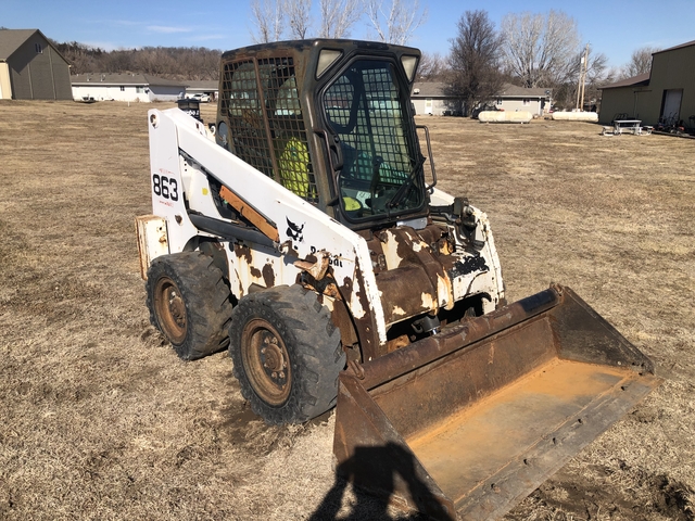 2001 Bobcat 863 Skidloader 3860 hours, enclosed cab- heat works, high flow hydraulics, airless tires, Deutz 73 hp diesel engine, front wiper works, all glass good, fresh oil and filter change, new air filter, runs and operates good, self leveling bucket, front lights work , foot controls for loader, AC does not work, sold as-is, firm price