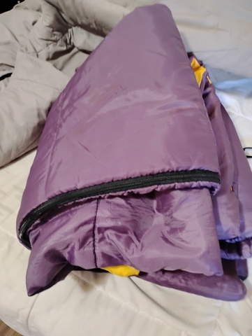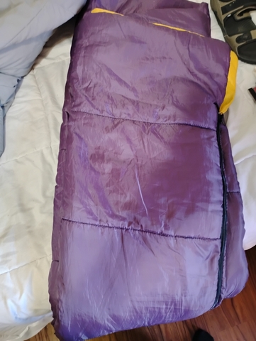 A purple sleeping bag in real good condition for five dollars only. what a buy!!!!