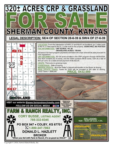 Excellent opportunity to purchase 320± acres of CRP and grassland located in Sherman County, Kansas, just north of Goodland. This tract offers a strong combination of dependable conservation income and quality grazing potential, making it well suited for investors, cattle producers, or those seeking recreational acreage. The property is conveniently located from the intersection of Highway 27 and Road 67 in Goodland, traveling 7 miles north to Road 74, then 2 miles east to Road 22, and 1/2 mile north to the property. Signs will be posted for easy identification. According to FSA records, the farm includes approximately 161.36 acres enrolled in the Conservation Reserve Program (CRP) through September 30, 2036, with an annual payment rate of $53 per acre, providing a total yearly income of $8,552.00. The CRP acres are split between the SE/4 and SW/4 portions of the property. In addition, the tract contains approximately 158.64± acres of grassland, offering excellent supplemental grazing opportunities. There are no growing crops, and possession will be granted at closing. All future FSA program payments will follow the land and be paid pursuant to FSA regulations. Seller's mineral interest will transfer to the Buyer at closing. Real estate taxes for 2026 will be prorated to the date of closing (2025 taxes were $896.84). This is a versatile western Kansas property with reliable CRP income, grassland acreage, and convenient access near Goodland. For more information, maps, or to schedule a showing, please contact the listing agent, Cory Busse, at 785-332-8345.