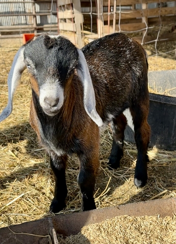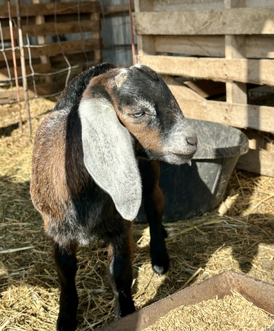 8 week old Mini Nubian buckling. Beautiful colors, blue eyes. Has been disbudded, vaccinated, and vet checked! Ready anytime. Can whether upon request. $200