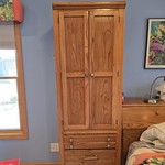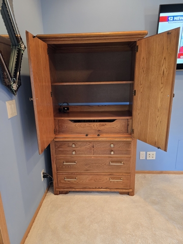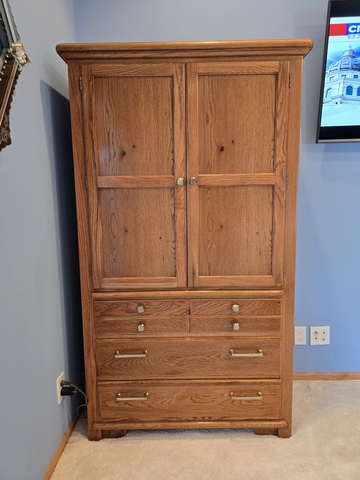 This piece is a Thomasville American Country Collection armoire, specifically a solid oak door chest from the early American-style line.