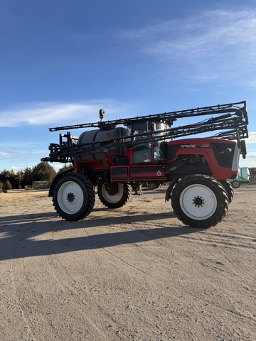 Apache GT sprayer with large tires and a wide spraying mechanism. Has a digital display and control panel inside the cabin. 1934.1 Engine hours. The sprayer is equipped with multiple nozzles and A 1200 gallon tank. For questions call Mike @ 785-672-0315.