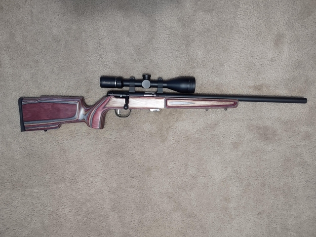 Savage Mark II, 17HM2, 21" heavy barrel, in Boyd's stock with Burris 4.5-14x scope. In excellent condition.