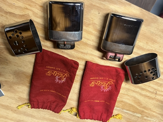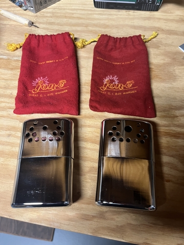 Jon-E hand warmer is a vintage, refillable, chrome-plated metal heater from Aladdin Laboratories that uses lighter fluid to provide 12–24 hours of heat via an internal, flameless catalytic burner.