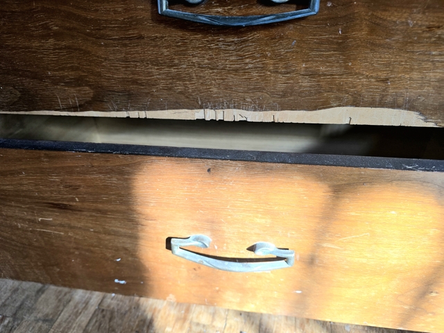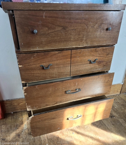 All drawers open and close. Shows visible cosmetic wear and some chipped veneer (see photos). Bottom drawer has damage but is still usable. Back panel is missing.