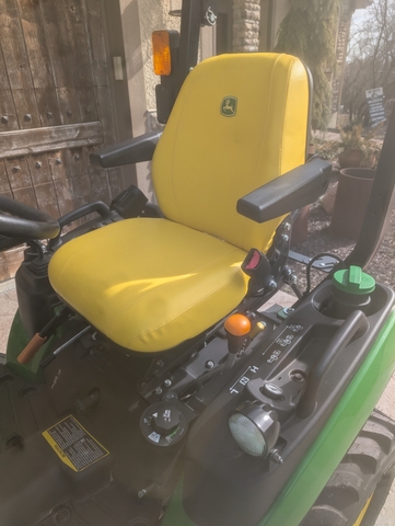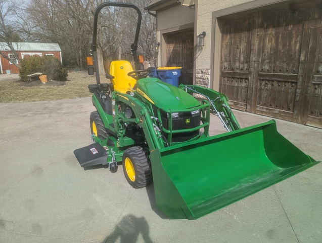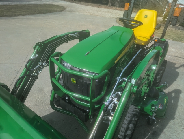 2024 John Deere 1025R tractor with four-wheel drive. Engine is a Yanmar diesel rated at 25 horsepower. Hydrostatic transmission with pedals for forward and reverse, and cruise control. Rear 3-point and 540 PTO. Loader is a John Deere 120R with 54" bucket and 1000lbs lift capacity. Mower is a John Deere 60D deck with a 60" cutting width and AutoConnect functionality with drive over connection. Equipped with the Premium Operator's Station with Deluxe seat with suspension and armrests.