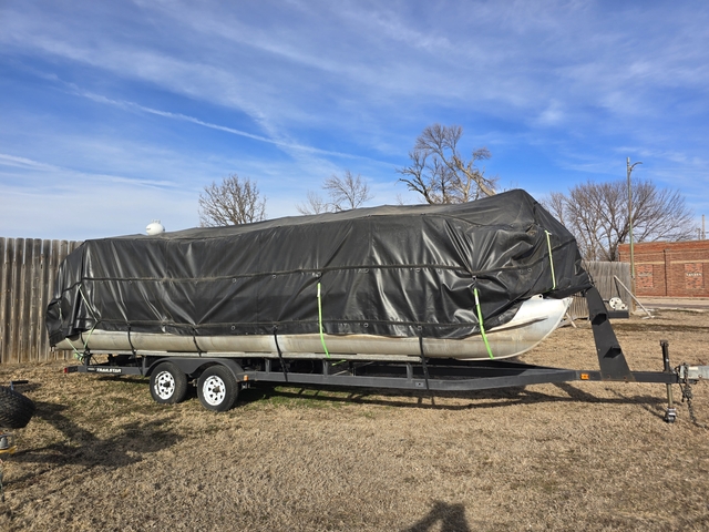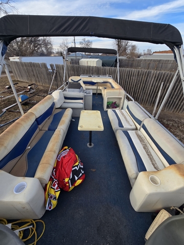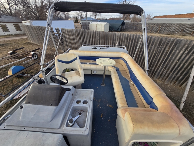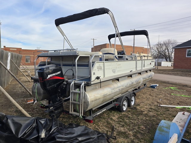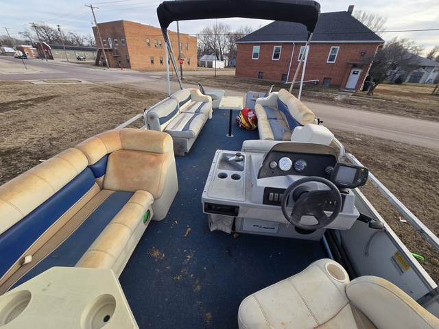 I am selling this on consignment for a customer. It's a 1995 Sun Tracker 24 ft pontoon boat on a 1995 Tracker pontoon boat trailer. Titles in hand for both. Carpet has wear and tear but floor seems to be solid except for the very tip of the front getting a little bit spongy. But that's like the end 4 in of the point where you don't step anyway. The upholstery is sunscorged or stained however you want to describe it but it is still pliable and more than usable just looks not so great. They use this for all sorts of things including tubing and those tubes are included. Also as you can see there are two bimini tops and it comes with a very nice heavy duty tarp. The motor is a 2004 115 horse Mercury 2 stroke. Normally I have a video of these things running I have not had a chance to do so yet so in the coming days when I have a nice day I will add a video if I still have it by then. She's not the prettiest in the world but she's definitely great for a large party. Located in Fairmont, NE. 1 hour straight north of Belleville Kansas
