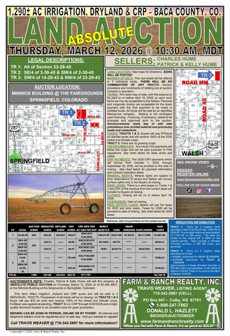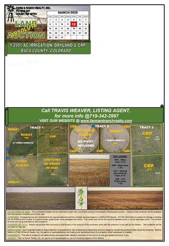 Farm & Ranch Realty, Inc. is pleased to present approximately 1,288± acres of diversified agricultural land located in Baca County, Colorado. This property will be offered at Absolute Public Auction on Thursday, March 12, 2026, at 10:30 AM MDT at the Minnick Building at the Fairgrounds in Springfield, Colorado. The offering includes a combination of irrigated cropland, productive dryland acres, and established CRP, providing strong income potential and operational flexibility.