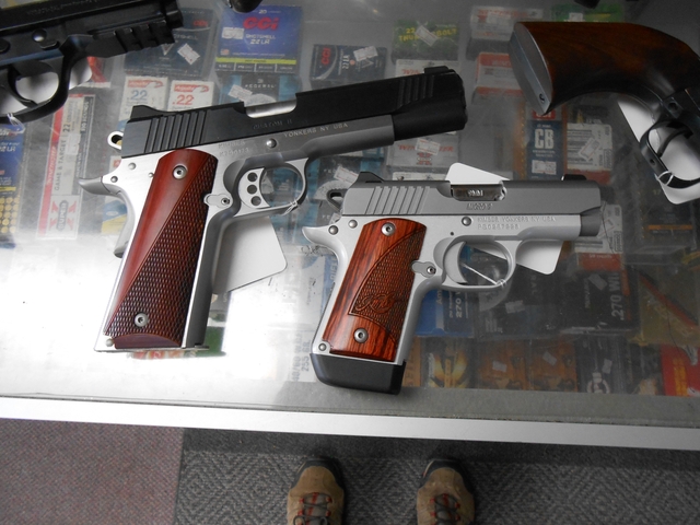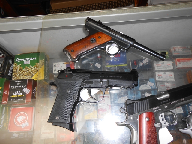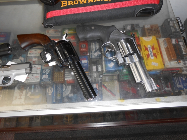 eagle gun and coin in ellinwood has in stock a nice selection of hand guns. we curently have smith and wesson,ruger, kimber ,beretta as well as several other brands. we range from .22 ,25 auto ,380acp ,9mm 40s&w 357 mag 45acp and 44mag. and can special order most models. any questions please ask