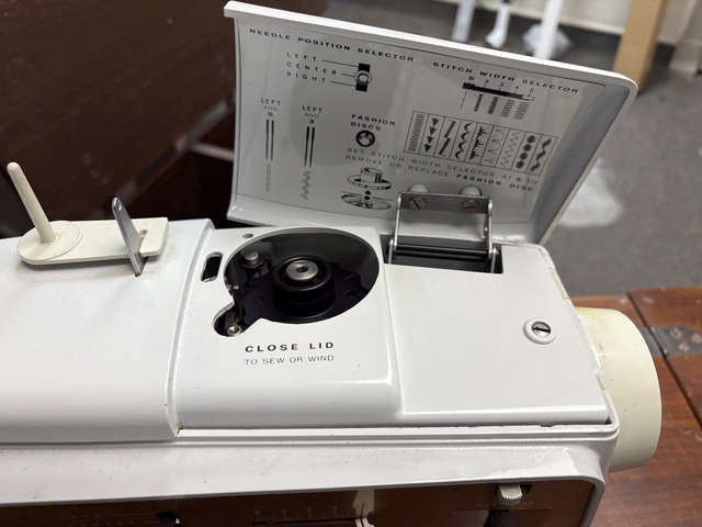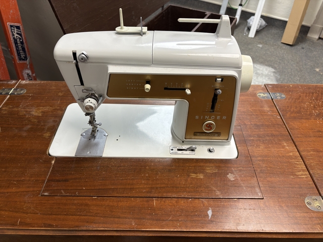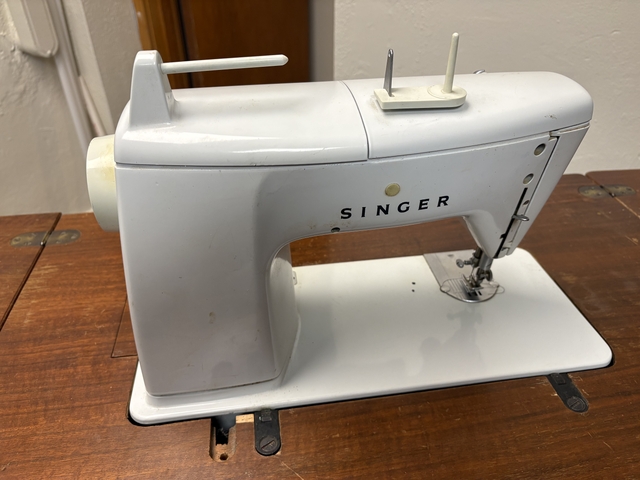 No power cord. Can get online . Works freely. Y hand. Seems to work. Table is old and could use restoration. Machine is well lubricated and I believe would be a good sewing machine. It's an antique and I couldn't throw it away.