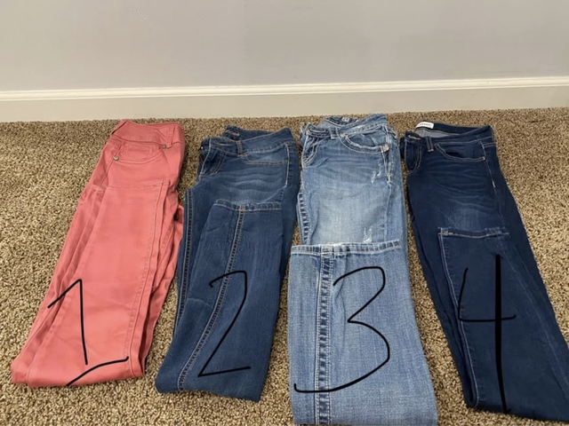 1. Pink Maurice’s skinny jeans- never worn. Size XS-R2. Maurice’s skinny jeans. Never worn. Size XS-R3. Miss me’s. Hardly worn. Size 25 waist4. Flying monkey skinny jeans. Never worn. Size 25 waist