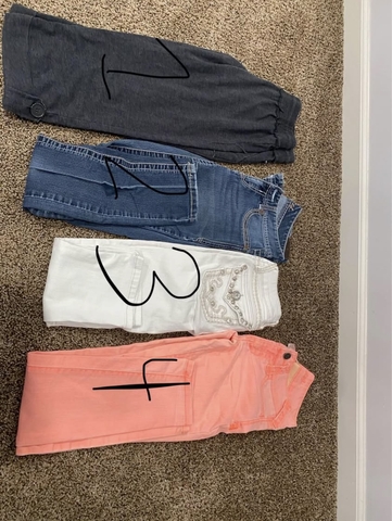 1: lounge capris. Hardly worn. Size small. $102: Maurice’s skinny jeans. Worn. Size XS. $103: white capris. Worn. Size 0. $104: peach Maurice’s skinny jeans. Never worn. Size XS. $15