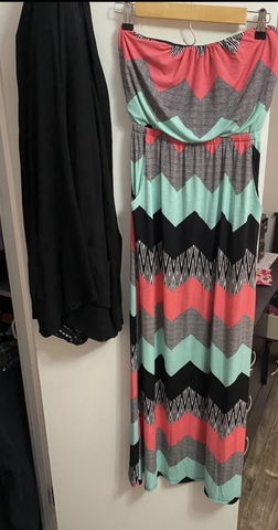 - Strapless pink, black, white and teal maxi dress. Has pockets. Size x-small. $10
