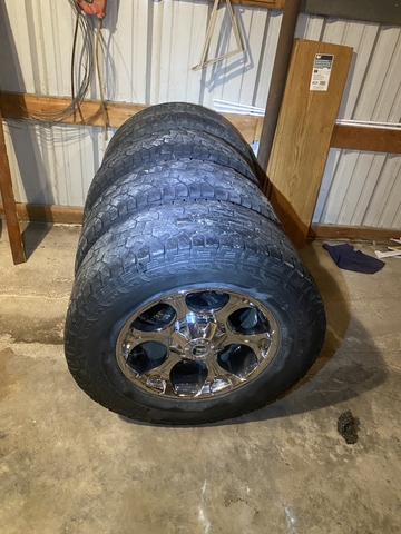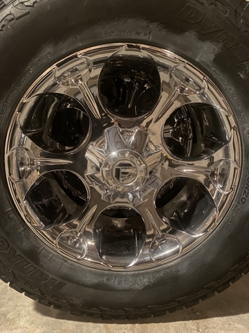 Nice looking universal 20 inch chromes, some surface pitting but should clean up with some elbow grease. Tires are high quality 35s by my standards but only have about 20-30% tread.