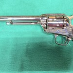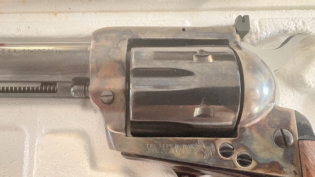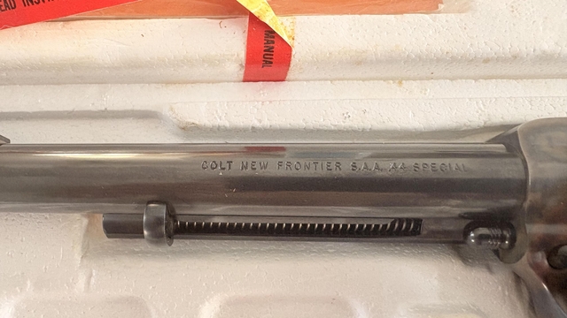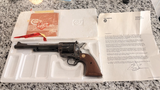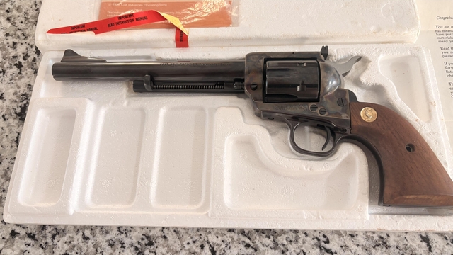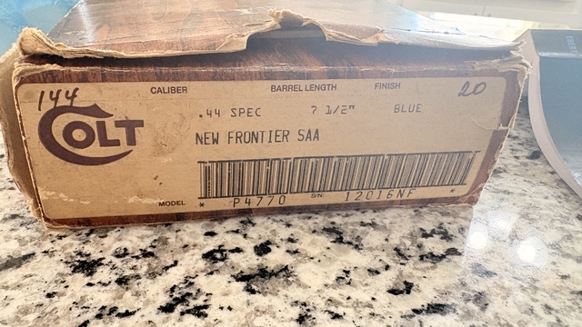 I have a 1979 Colt SAA New Frontier revolver with 7.5 inch barrel chambered in .44 Special up for sell. This one is New with the original box and manual and Colt letter. No turn line. The box is in 95% condition. The original smooth walnut grips, numbered to this gun, are included. This revolver was made in 1979 according to the Colt and the serrial numbers.The serial number is 12016NF.