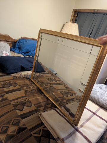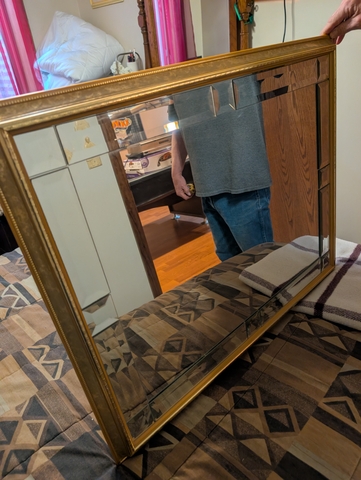Stylish gold frame mirror. Has pretty beveled edges all around, gives cool look. Rectangular shape.30.5" x 24.5"."