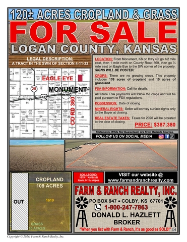 This 120± acre tract located in Logan County, Kansas offers a well-balanced combination of productive cropland and grassland in a desirable area near Monument. Legally described as a tract in the SW/4 of Section 4-11-33, the property includes approximately 109 acres of cropland and 10 acres of grassland. Soils are primarily Keith silt loam with 0–1% slopes, supporting consistent agricultural production.