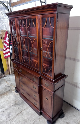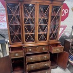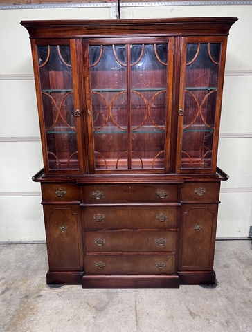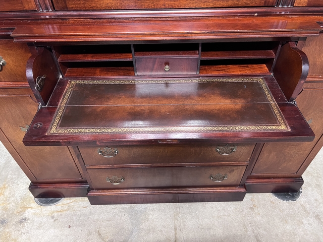 This is a 2 Pc. Saginaw Furniture Mahogany Inlaid Butlers Desk BUBBLE GLASS Breakfront China Hutch with a Breakfront Drawer. (IF YOU CAN FIND THESE ONLINE, THESE SELL FOR $4000-$7000)!! This cabinet has 2 thick pieces of glass in the top, and this cabinet is LIGHTED as well to show it off! The glass is called “Bubble Glass” that is a wavy glass, that really reflects the light! The front center drawer opens up and unlocks for a leather tooled area with compartments. This is a 2 pc for easier moving, but can be secured on the back to lock them together! (I HAVE ANOTHER LARGER SIMILAR BUBBLE GLASS CUPBOARD I AM SELLING SEPARATELY). Measurements are 54 1/2” Wide, 14 1/2” Deep, 74 1/2” Tall. (NO HOLDS)(NO DELIVERIES)(CASH ONLY) LOCATED IN HAYS, KS (REDUCED)