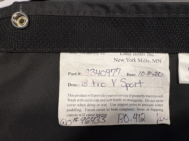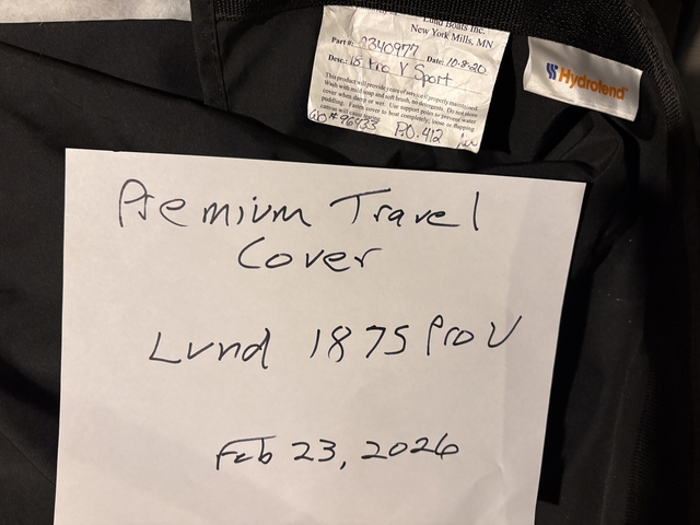 An essentially new Lund Premium Travel cover for 2017 Lund 1875 Pro V. Cover is in new condition except for attachment damage at bow (see photo). A little repair work for strap and snap would result in a new condition, high quality travel cover. Top of the line cover for Lund. Cover attaches to exterior sport track and should fit 1875 Pro V through 2022.