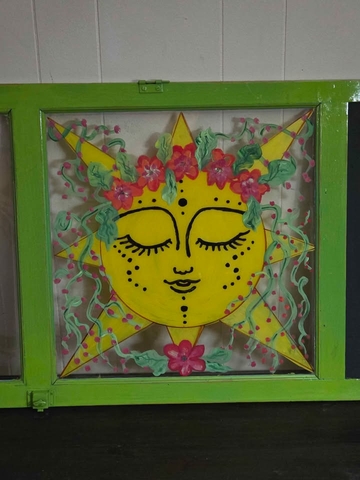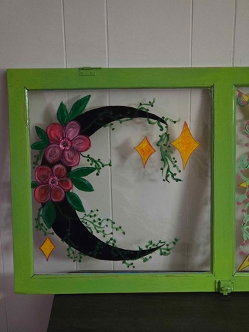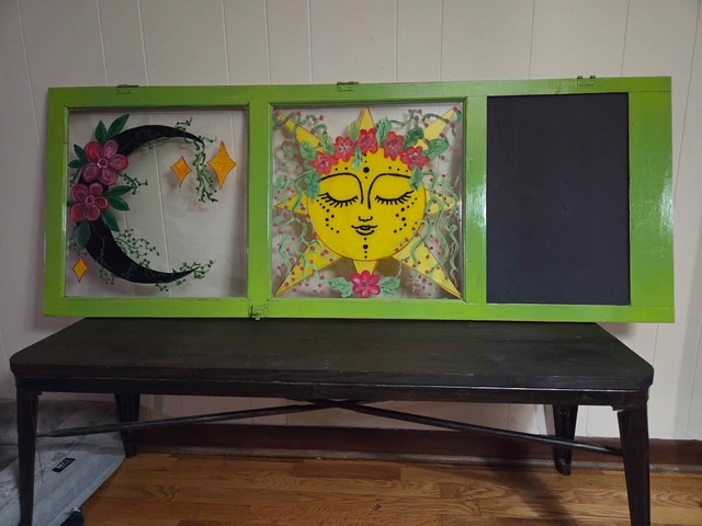 Antique window that has been hand painted in acrylic with Moon and Sun designs with a small chalkboard. Frame measures 57.5" L x 22" H. Frame has been spray painted in a bright lime green. D hooks added to the back for easy hanging.