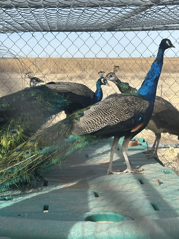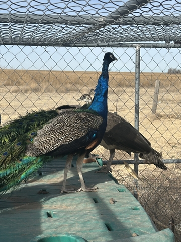 I have three pairs of blue peacock and peafowl. They have been raised on a farm. Birds are located between Ulysses and Hugoton off hwy 25. I am pricing them at $100 each. Price reduced.)
