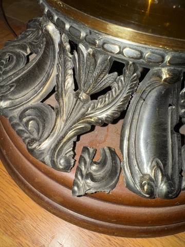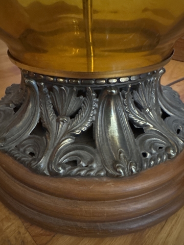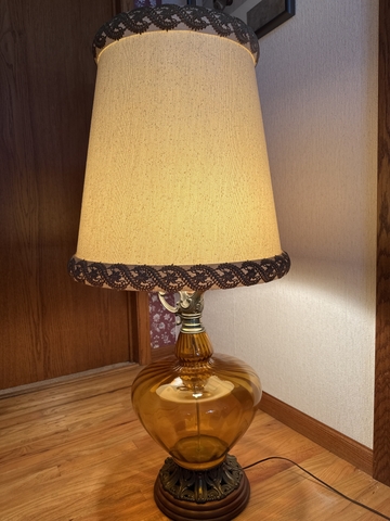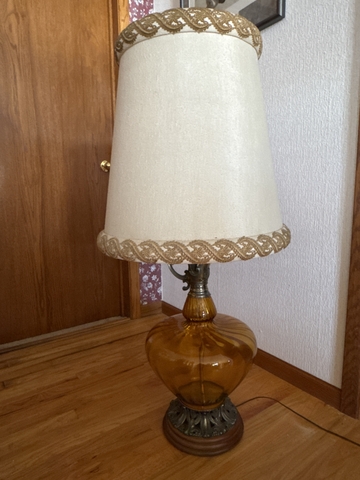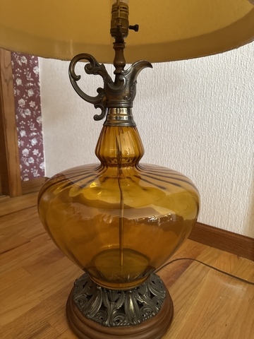 This is an oversized vintage lamp. Amber glass for body, which appears to be like a watering pitcher. The base consist of sustained with decorative metal. There is a little piece of decorative metal that' broke off but is included. The lamp shade is off white with gold accents both top and bottom. It does work. It's one of a kind.